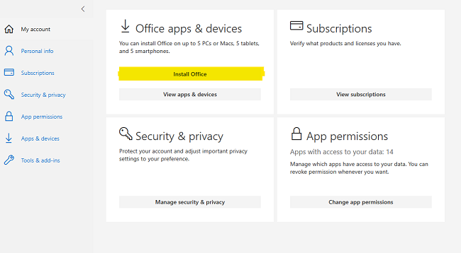 - Once signed in, under the section titled "Office apps & devices" select "Install Office"